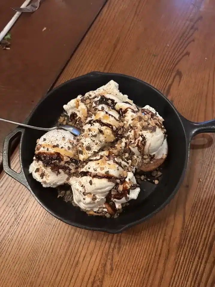 This is served warm and piled on top of all that deliousness is a heaping mound of vanilla ice cream topped with a generous drizzle of chocolate sauce and crumbled toffee and chocolate bits. Because this deserves two photos; enjoy.